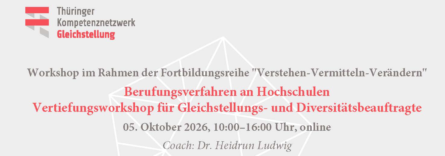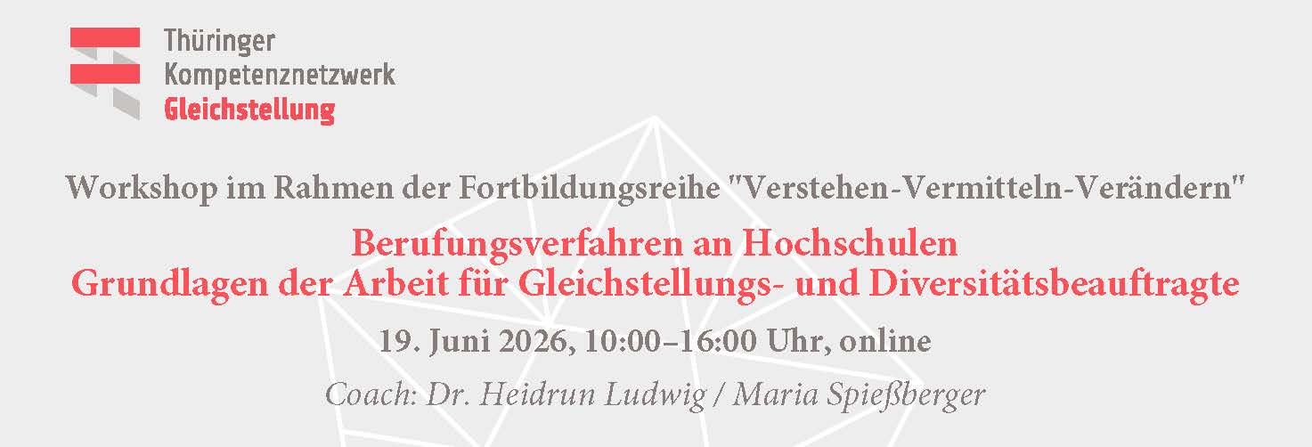 Der Vertiefungsworkshop richtet sich an bereits mit Berufungsverfahren vertrauten Gleichstellungs- und Diversitätsbeauftragte der Thüringer Hochschulen. Ziel des Workshops ist gemeinsam Erfahrungen aus der Berufungspraxis zu reflektieren und neue Lösungen für spezifische Situationen auszuloten.