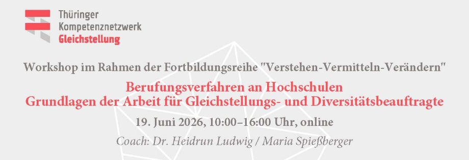 Der von Dr. Heidrun Ludwig und Maria Spießberger geleitete Workshop richtet sich an Gleichstellungs- und Diversitätsbeauftragte der Thüringer Hochschulen und wird am 19. Juni 2026 von 10:00 bis 16:00 Uhr als Onlineveranstaltung angeboten.