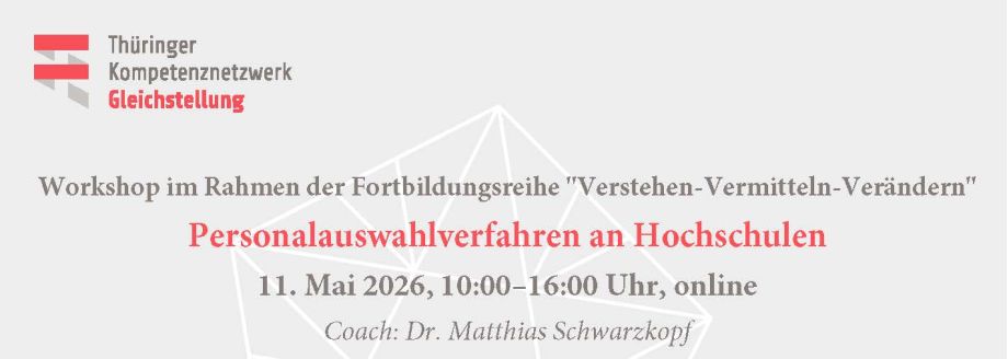 Der von Dr. Matthias Schwarzkopf geleitete Workshop richtet sich an Gleichstellungs- und Diversitätsbeauftragte der Thüringer Hochschulen und wird am 11. Mai 2026 von 10:00 bis 16:00 Uhr als Onlineveranstaltung angeboten.